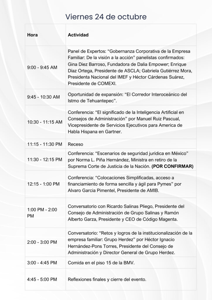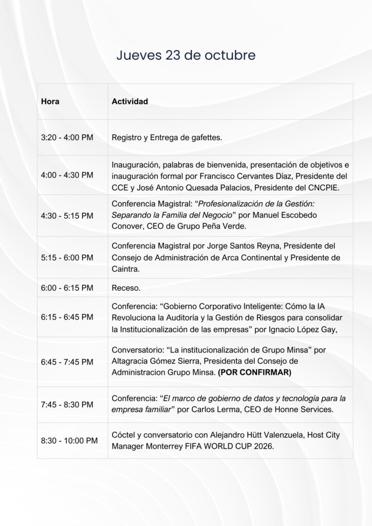 Te invitamos a un espacio de alto nivel donde líderes empresariales, consejeros independientes, inversionistas y académicos se reúnen para reflexionar sobre el presente y futuro de la empresa familiar en México. Durante el 23 y 24 de octubre, se abordarán temas clave como la profesionalización de la gestión, la planificación de la sucesión, la adopción de tecnologías emergentes y el fortalecimiento de las estructuras de gobernanza.